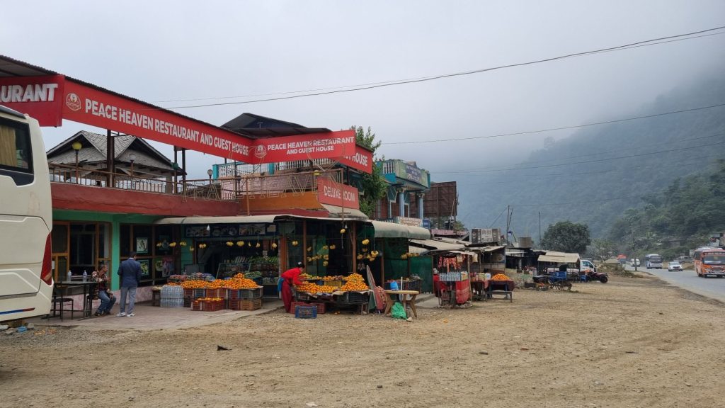 Chaufføren holder ind kl. 10, han skal åbenbart have frokost.  Vi er ikke sultne og køber nogle bananer og appelsiner istedet.