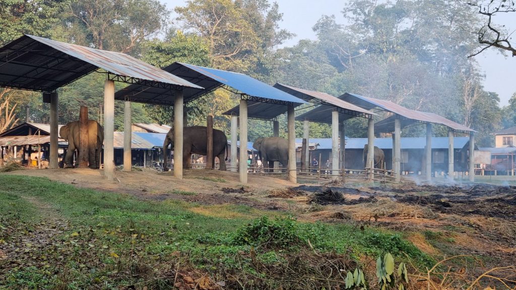 Forskningscenter i biodiversitet. Elefanterne bruges til transport ud i området.