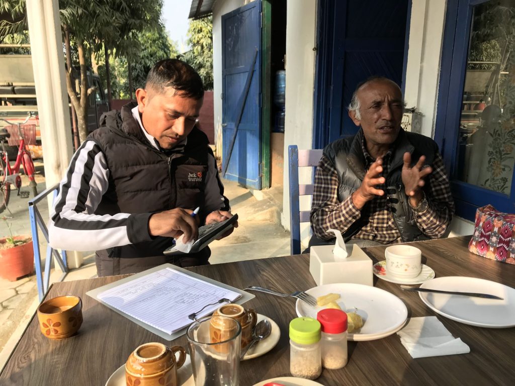 Vi er sultne og kan vælge mellem dal bhat hos Gokarna eller en tur ned til byen og en restaurant. På restauranten (😉) møder vi en fyr der skal arrangere vores tur. Han er Gokarnas nevø og så vidt vi forstår bestyrer han restauranten. Vi har tidligere talt med Gokarna om, at vi tænker at være her ca. en uges tid. Vi taler lidt med nevøen og han strikker et turforslag sammen.