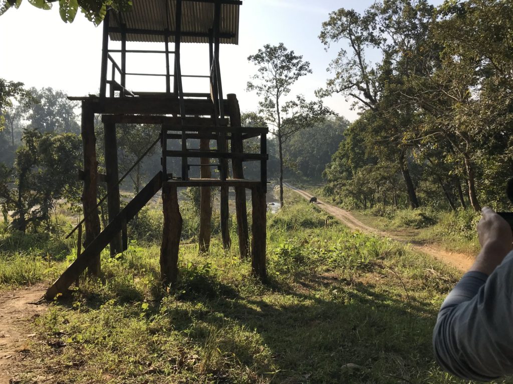 Næste stop er ved et bedaget vagttårn af træ, hvor vi får frokost. Vi får talt lidt med Gokarna, rart at lære ham lidt at bedre at kende. Vi bliver nær tårnet længe, flere jeeps med turister kommer forbi, de holder typisk stille fem minutter, så af sted igen.