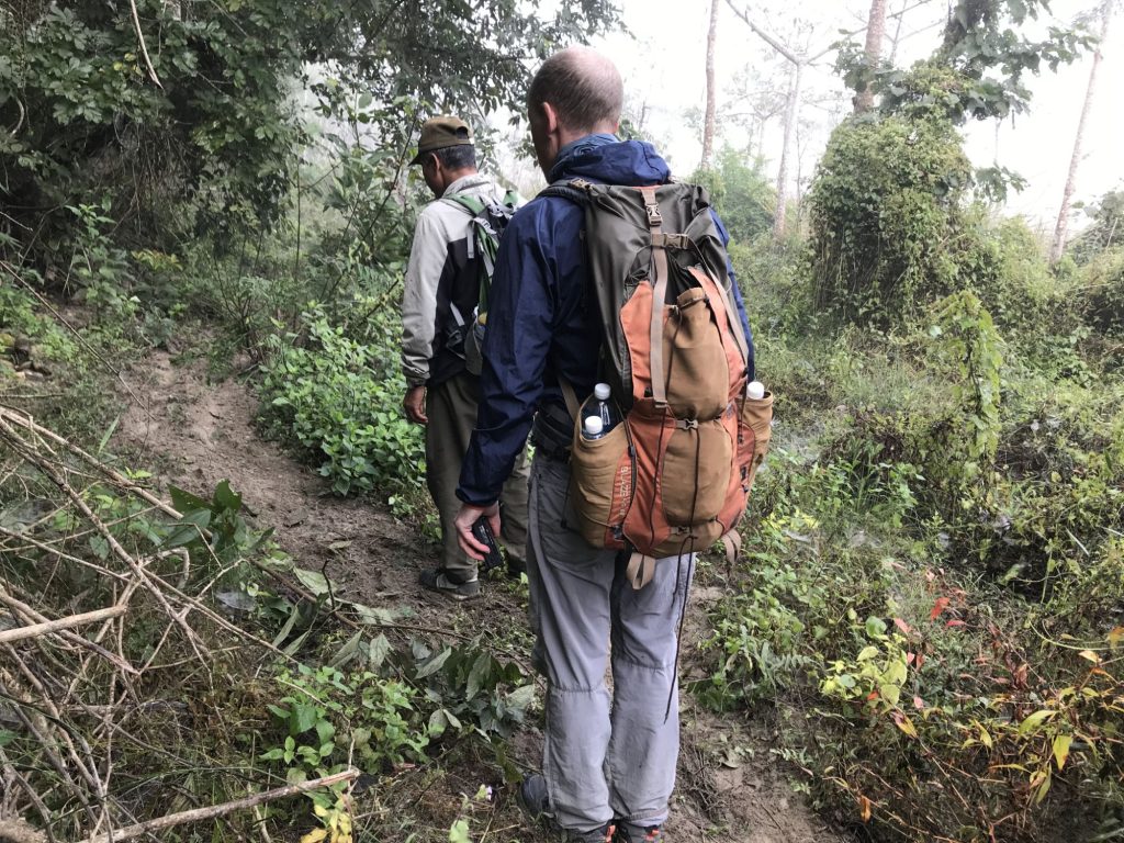 Vi går således videre langs floden, vi er nu i niveau med vandet, som ikke er til at se på grund af meter højt elefantgræs. Vi ser slæbespor fra han-næsehorn, han laver dem som en del af parringsritualet. Vi ser tiger-spor i sandet, de er helt friske. Og store! Guiderne er på dupperne, og udsynet er de fleste steder ikke mange meter. De er tydeligvis ikke helt rolige ved at være her, så inden længe går vi op i skoven igen, og snart er vi tilbage på plateauet. De fortæller, at det her sted er det bedste at være, så resten af eftermiddagen skal tilbringes her, hvor vi starter med frokosten. Anita får en lur på store blade, som guiderne plukker til formålet – og derover Gokarnas tørklæde.