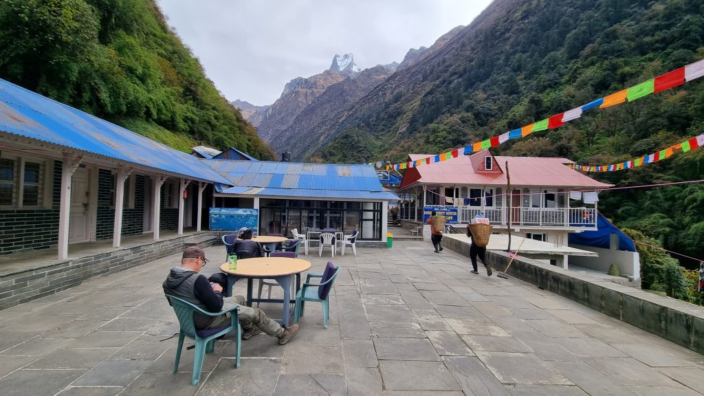 Idag er første dag på dette trek, hvor vi vågner til overskyet vejr. På grund af risikoen for højdesyge skal vi ikke gå så langt idag. Anbefalingerne siger højest 400-500m op pr. dag. Målet er Deurali, hvilket giver 700m. Vi er dog ikke så højt oppe endnu, så vi håber, at det er OK. Vi har god tid og spiser først morgenmad kl. halv otte. Der ryger to kopper kaffe ned, lidt imod anbefalingerne for at undgå højdesyge. En “americano” her er friskbrygget filterkaffe, og den er god.