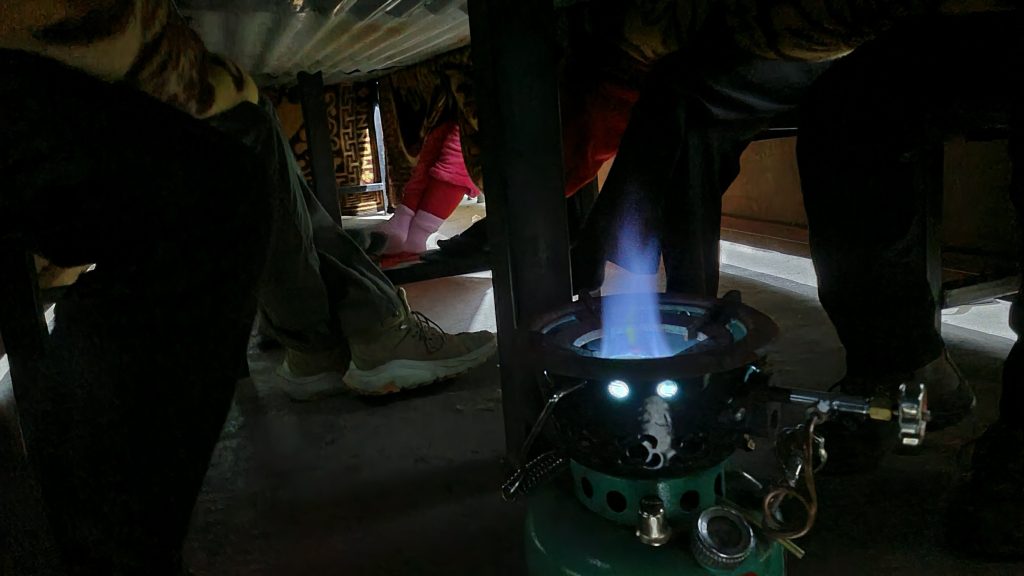 Indenfor på hotellet frådser vi i pomfritter med godt med salt. Michael er heldigvis helt frisk igen. Højden betyder, at det er blevet koldere og kulden sniger sig hurtigt ind på os i det uopvarmede fællesrum. Vi ser at man betale for en varmeovn, hvilket viser sig at være en petroleumsprimus under bordet. Vi er lidt skeptiske, men det virker godt.