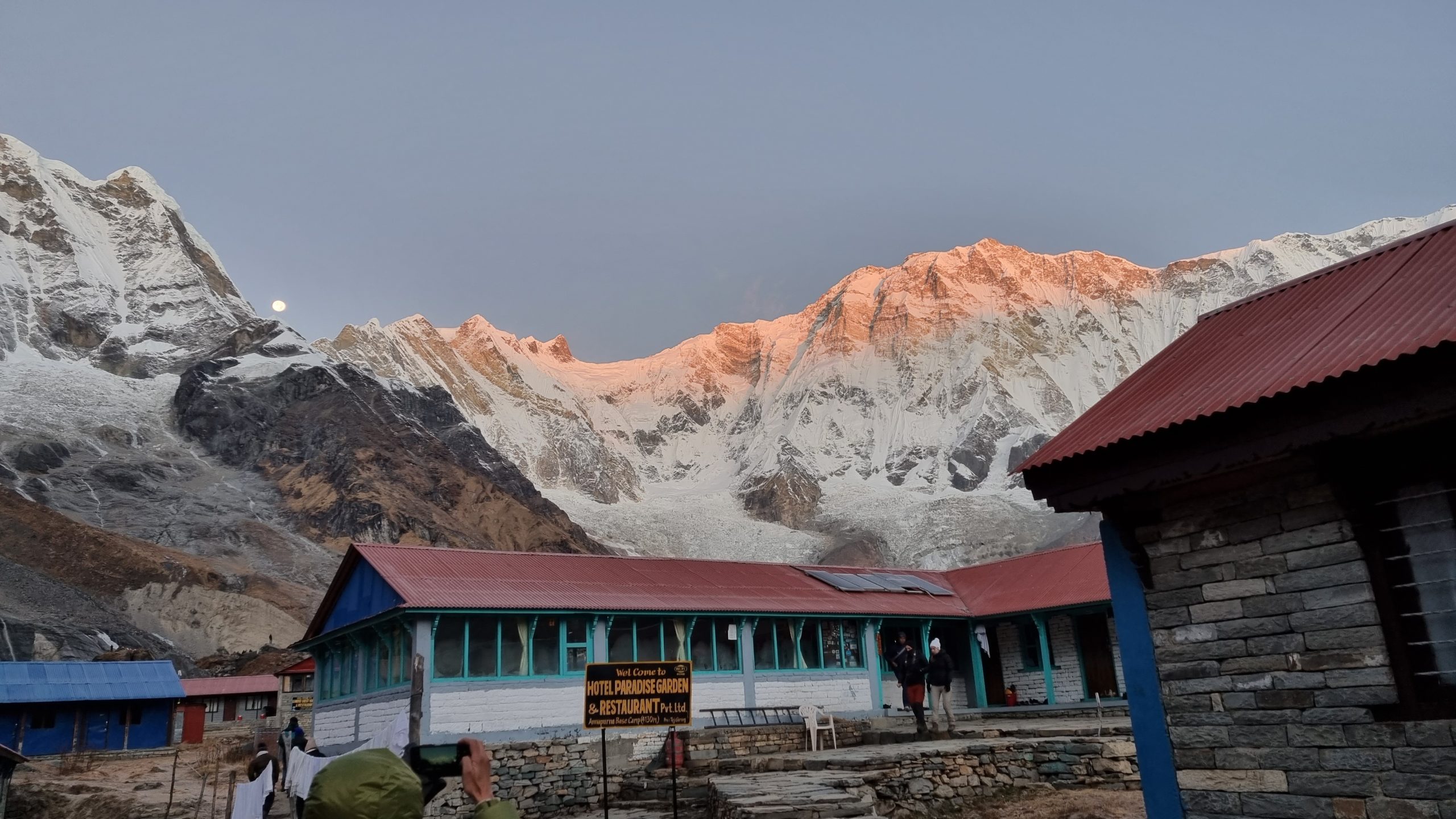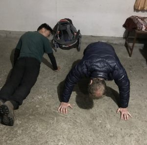 Teit har ikke sovet meget, det har været koldt også i soveværelset. Teit har det desuden lidt svært med den meget tunge og massive dyne. Under dynen er vores sommersoveposer og inden i soveposen er vi med det meste af vores tøj. På en firesengsstue, vi deler med Jackey og Michael, kan man ikke bare mosle rundt, men må forsøge at leve med det. Anita har heller ikke sovet super godt og Michael fortæller at han også var længe om at falde i søvn. Det betyder dog ikke noget, vi er rimeligt friske her til morgen. Jackey har sovet godt, og er nu allerede ude og se sig omkring. Han kommer springende tilbage, vi skal ud at se månen.