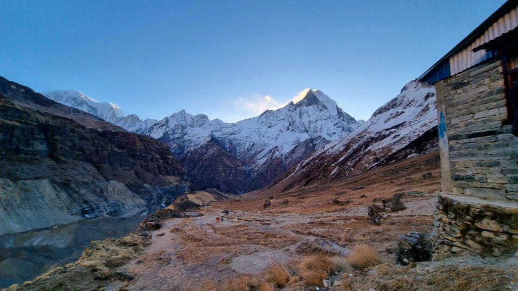 Vi ender med at overnatte i Bamboo, Jackey har for længst bestilt værelser, hvilket ikke viser sig at være nødvendigt. Eneste andre gæster er tre unge nepalesere og en lettere beruset australier. Han startede trekket i Gandruk i morges, det vil sige en seriøs lang tur, mest opad. Han fortæller, at han er pænt smadret i benene af samme grund og synes, at der må øl og rom til. Han er ikke helt letvægter, så vi håber, at han kommer godt op til ABC. Han siger ret mange sjove ting, vi griner så maverne hopper. Senere taler vi om, at vi ikke kan huske at have grinet så meget, som vi har gjort på disse tre treks meget længe.