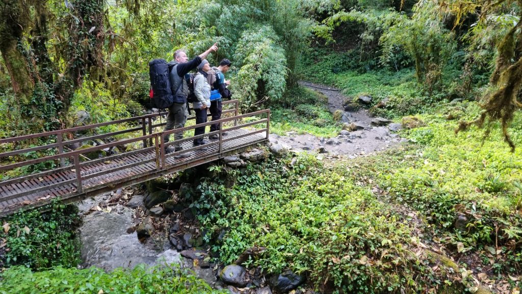Vi har gået ret meget nedad i dag. Teit måler præcist op, hvor mange højdemeter, vi er steget ned (vi har gået en del op i dag – så man kan ikke bare trække ABC 4130 fra Bamboo 2310), og vi ender på 2000 højdemeter ned. Det er en helt vild tanke – 2 kilometer lodret ned! Ikke underligt, at knæene spænder lidt.