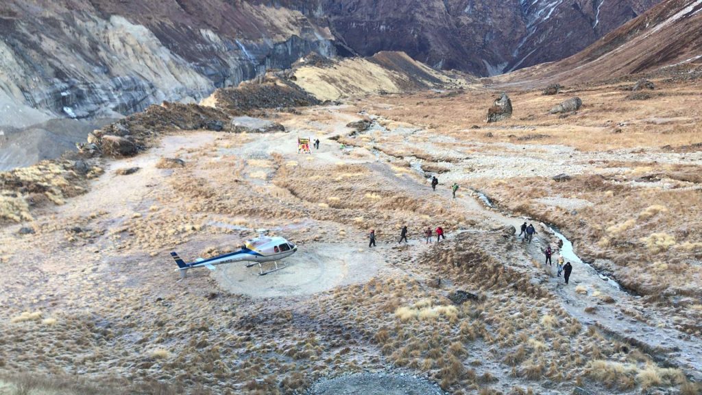 Allerede klokken lidt over syv ankommer den første helikopter. Der er to landingspladser – og ikke længe efter ankommer den anden. Den viser sig at indeholde et brudepar, hende i hvidt – og der bliver udvekslet ringe får vi senere at vide. Den første helikopter skal have tre malaysere med ned, de er for udmattede til at gå ned.