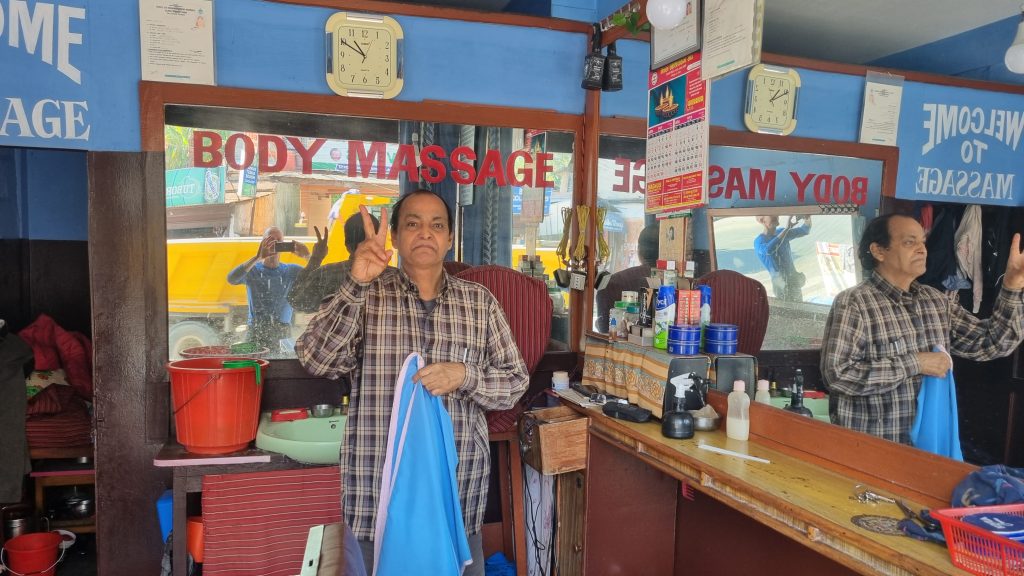 Der er et formål med dagen i dag; at lave så tæt på ingenting som muligt. Det bliver til lang morgenmad på cafe og slentren rundt i sidegaderne. Anita er på udkig efter kvindelig frisør og er ikke sen til at kaste sig ind til den første og bedste – håret er ikke blevet klippet siden de første dage i Katmandu. Der er en åben dør ud til området bag salonen, og i spejlet er det muligt at følge med i alt, hvad der foregår: Forsøg på at få høns til at makke ret, vask af sengetøj (i hånden), andre suser rundt med græs-koste. Det er måske noget uvant for den unge frisør at klippe kort hår (alle nepalesiske kvinder har langt hår), hun gør sig umage, og det bliver ganske fint. 500 rupee (25 kroner) – og en lille slat oveni.