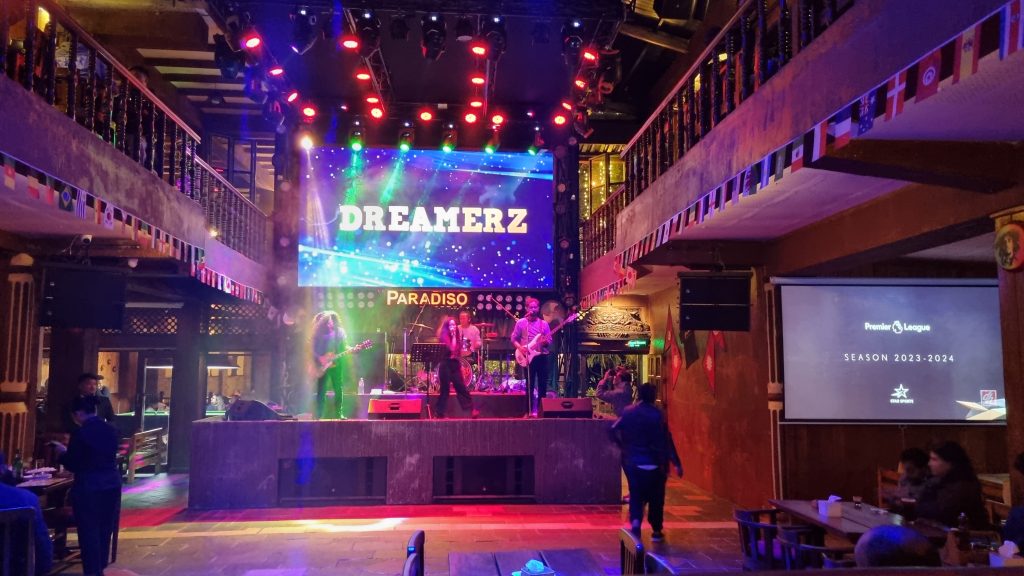Dreamerz spiller både nepalesisk musik og kendte popnumre, Jackey synger med, og det er vældigt fornøjeligt.