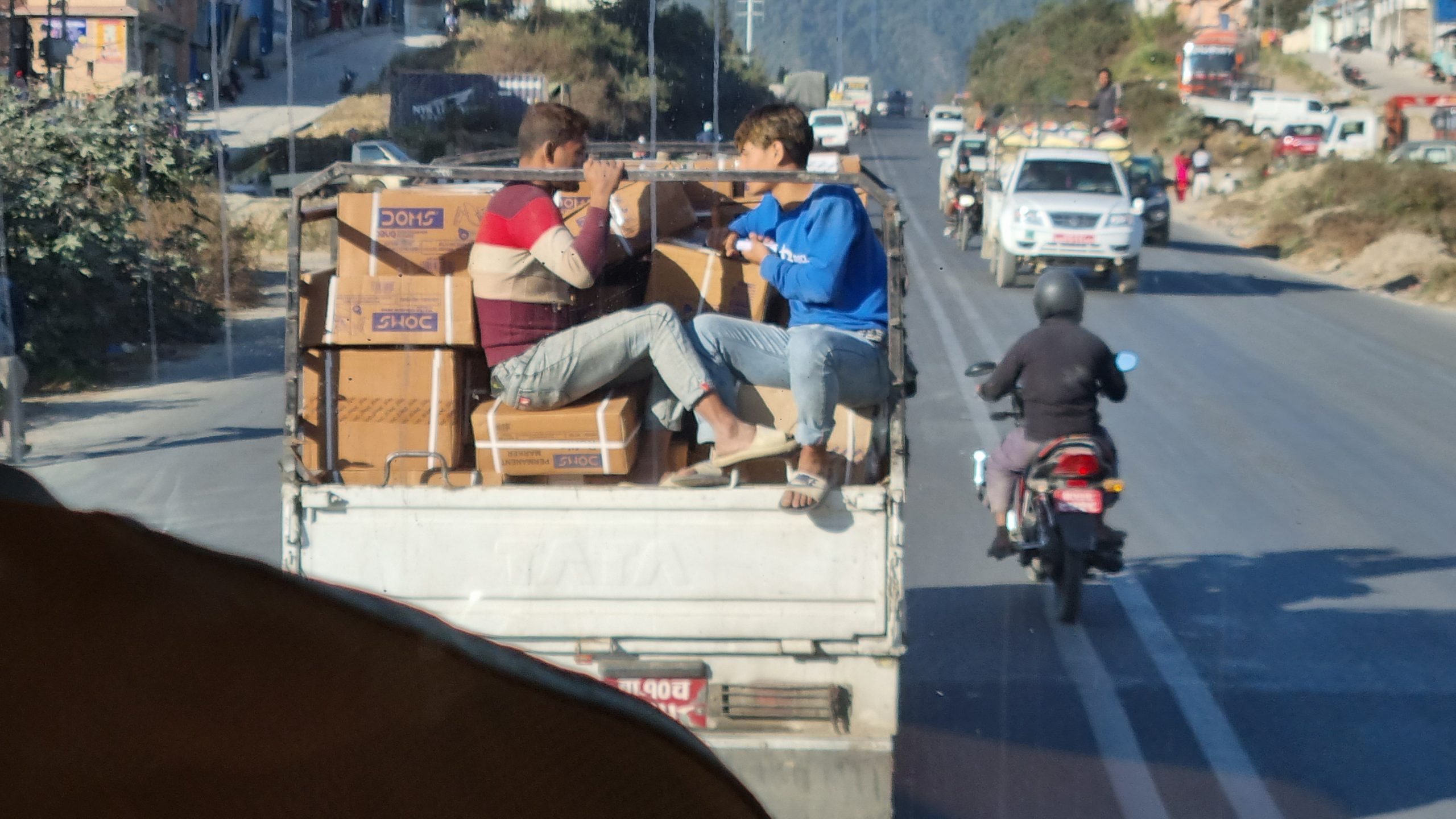 Der holdes de sædvanlige korte tissepauser samt en lille halv times frokostpause halvvejs. Anita sover det meste af vejen, Teit sover slet ikke. Han har fuldt udsyn til et hav af mere eller mindre hasarderede overhalinger, som alle går godt. På rekordtid når vi Katmandu, 8 timer helt præcist.